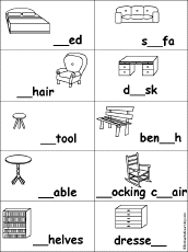 Missing Letters in Furniture Words Find the missing letters in furniture words, and then color the picture of the word. The words are bed, sofa, chair, desk, stool, bench, table, rocking chair, shelves, dresser. May 13, 2005 |