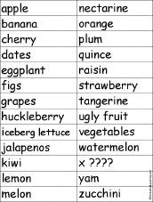Find a Fruit or Vegetable for Each Letter See if you can think of and write down a fruit or vegetable for each letter of the alphabet. Or go to a sample answer page. May 20, 2005 |