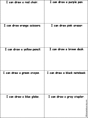 I Can Draw School-Related Items Draw and color school-related words, including red chair, purple pen,orange scissors, pink eraser, yellow pencil, brown desk, green crayon, black notebook, blue globe, gray stapler. May 16, 2005 |