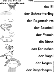 Match German Spring Words and Pictures Match 10 German Spring words to their pictures. The words are: das Ei/egg, der Schmetterling/butterfly, der Regenschirm/umbrella, der Baseball/baseball, der Frosch/frog, die Biene/bee, das Kaninchen/rabbit, der Vogel/bird, der Regen/rain, der Regenbogen/rainbow. Or go to the answers. Monday, May 1, 2006 |