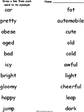 Match the Synonyms #1 Match 10 words to their synonyms. The words are car/automobile, pretty/cute, obese/fat, aged/old, bad/awful, icy/cold, bright/light, gloomy/cheerful, happy/cheerful, jump/leap. Or go to the answers. Tuesday, May 2, 2006 |