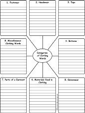 Write Clothing Words by Category Write 5 clothes words for each category. The categories include: Footwear, Headwear, Tops, Bottoms, Outerwear, Materials Used in Clothing, Parts of a Garment, and Miscellaneous Clothing Words. Or go to sample answers. Wednesday, November 18, 2009 |