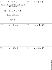 Solve Linear Equations Worksheet: Negative Number Answers Solve 10 simple linear equations by adding or subtracting a constant from each side of the equation. These problems all have a negative number as an answer. Worksheet #1 or go to the answers. Worksheet #2 or go to the answers. Worksheet #3 or go to the answers. Worksheet #4 or go to the answers. Worksheet #5 or go to the answers. Monday, October 19, 2009 |