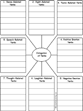 Write Verbs by Category #4 Write 5 verbs for each category. The categories include: Sense-Related Verbs, Sight-Related Verbs, Taste-Related Verbs, Positive Emotion Verbs, Negative Emotion Verbs, Laughter-Related Verbs, Thought-Related Verbs, Speech-Related Verbs. Or go to sample answers. Friday, August 6, 2010 |