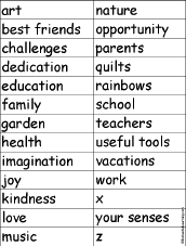 ![]() Find a Gratitude for Each Letter For each letter of the alphabet, write something you are thankful for. Find words for as many letters as you can. Or go to a sample answer page. Monday, November 19, 2012 |