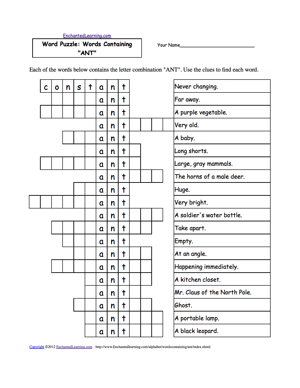 ![]() Word Puzzle: Words Containing "ANT" Each of the words in this worksheet contains the letter combination "ant". Use the clues to find each word. Or go to the answers. Or go to a pdf of the worksheet (subscribers only). Thursday, November 22, 2012 |