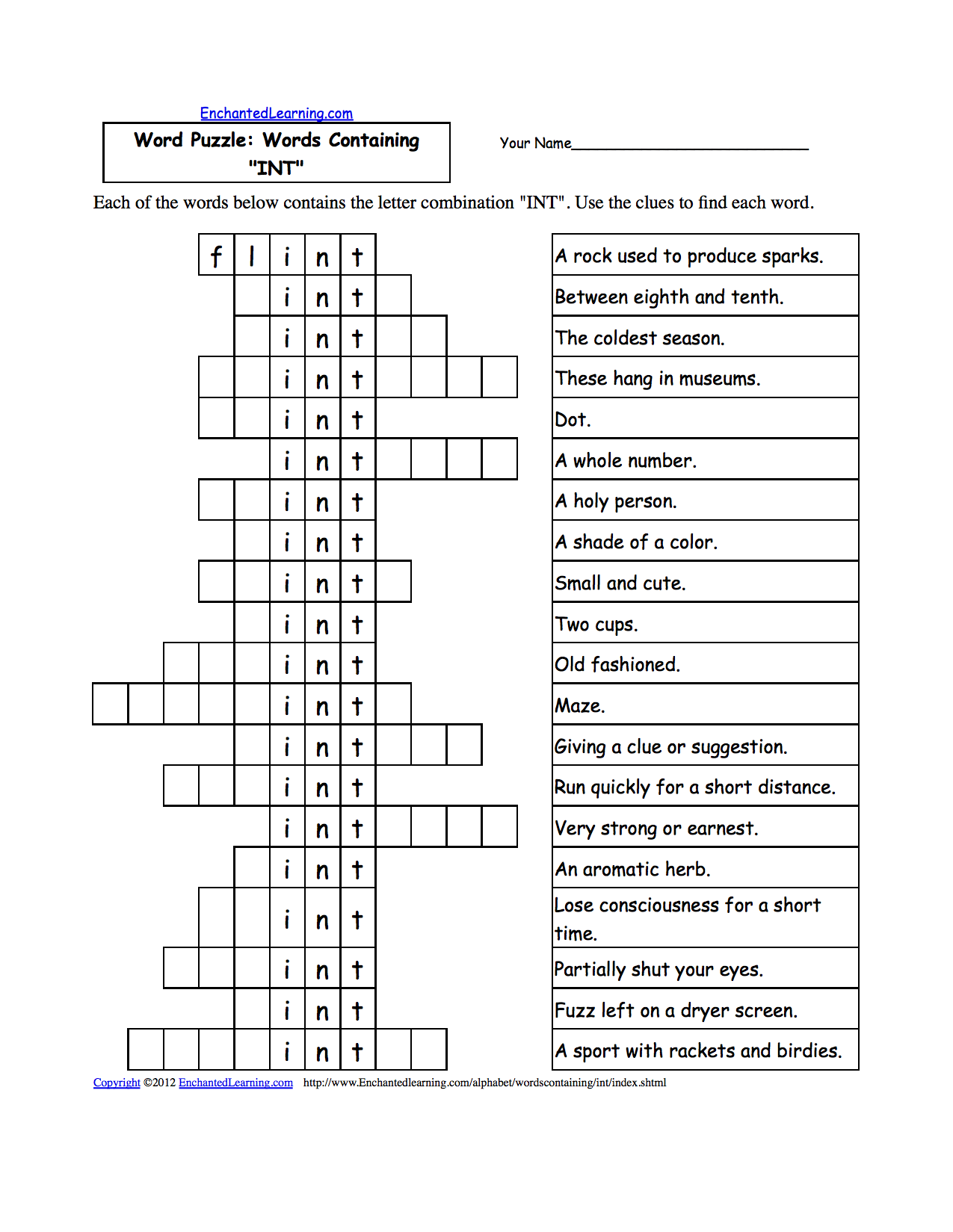 ![]() Word Puzzle: Words Containing "INT" Each of the words in this worksheet contains the letter combination "int". Use the clues to find each word. Or go to the answers. Or go to a pdf of the worksheet (subscribers only). Thursday, November 29, 2012 |