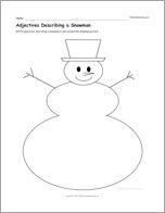 In this printable worksheet, write adjectives describing a snowman in and around the snowman picture.