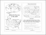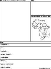 This printout helps the student do a short report on an African country, prompting the student to draw a map of the country, locate it on a map of Africa, draw the country’s flag, and write the country’s continent, capital city, area, population, name of currency, language(s), climate, type of government, and major industries.