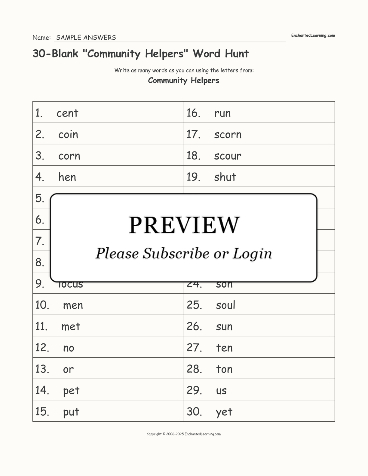 In this word hunt worksheet, make as many words as you can from the phrase "Community Helpers". This printout has 30 blank spaces.