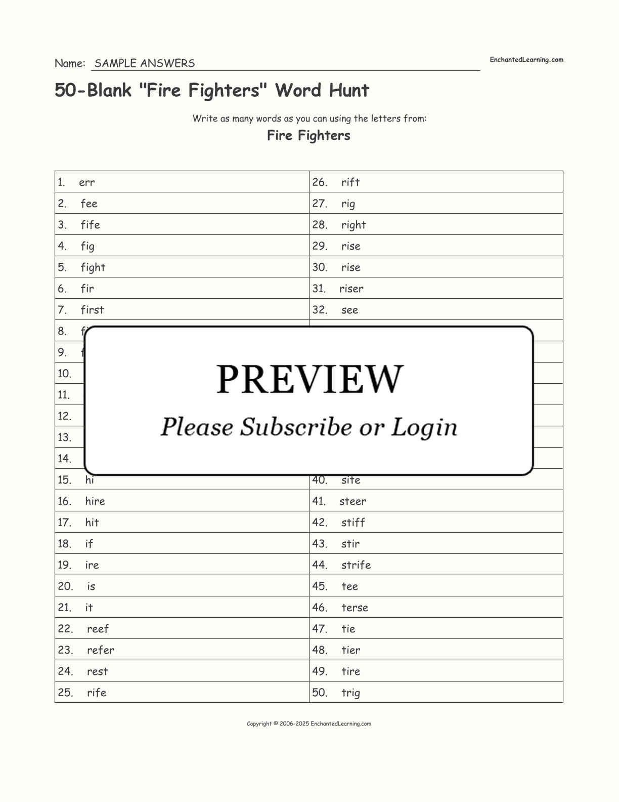 In this word hunt worksheet, make as many words as you can from the phrase “Fire Fighters”. This printout has 50 blank spaces.