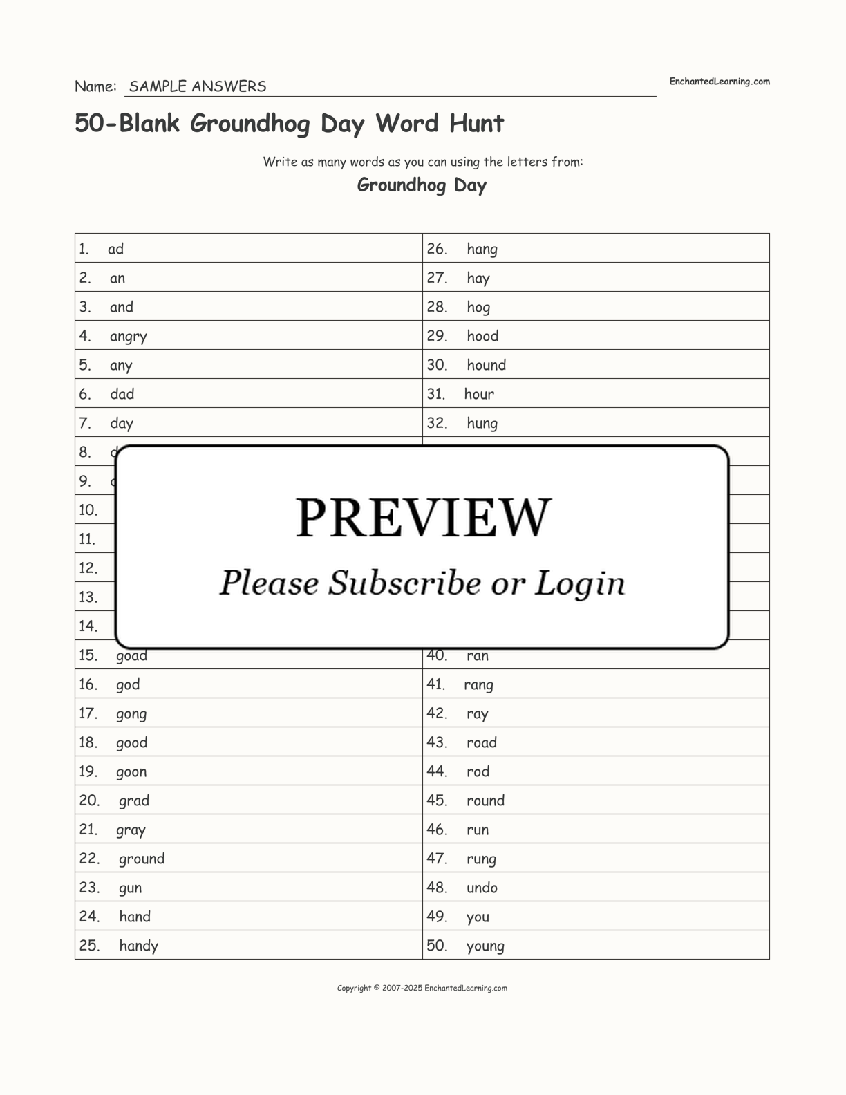 In this word hunt, make as many words as you can from the phrase "Groundhog Day". This printable worksheet has 50 blanks.
