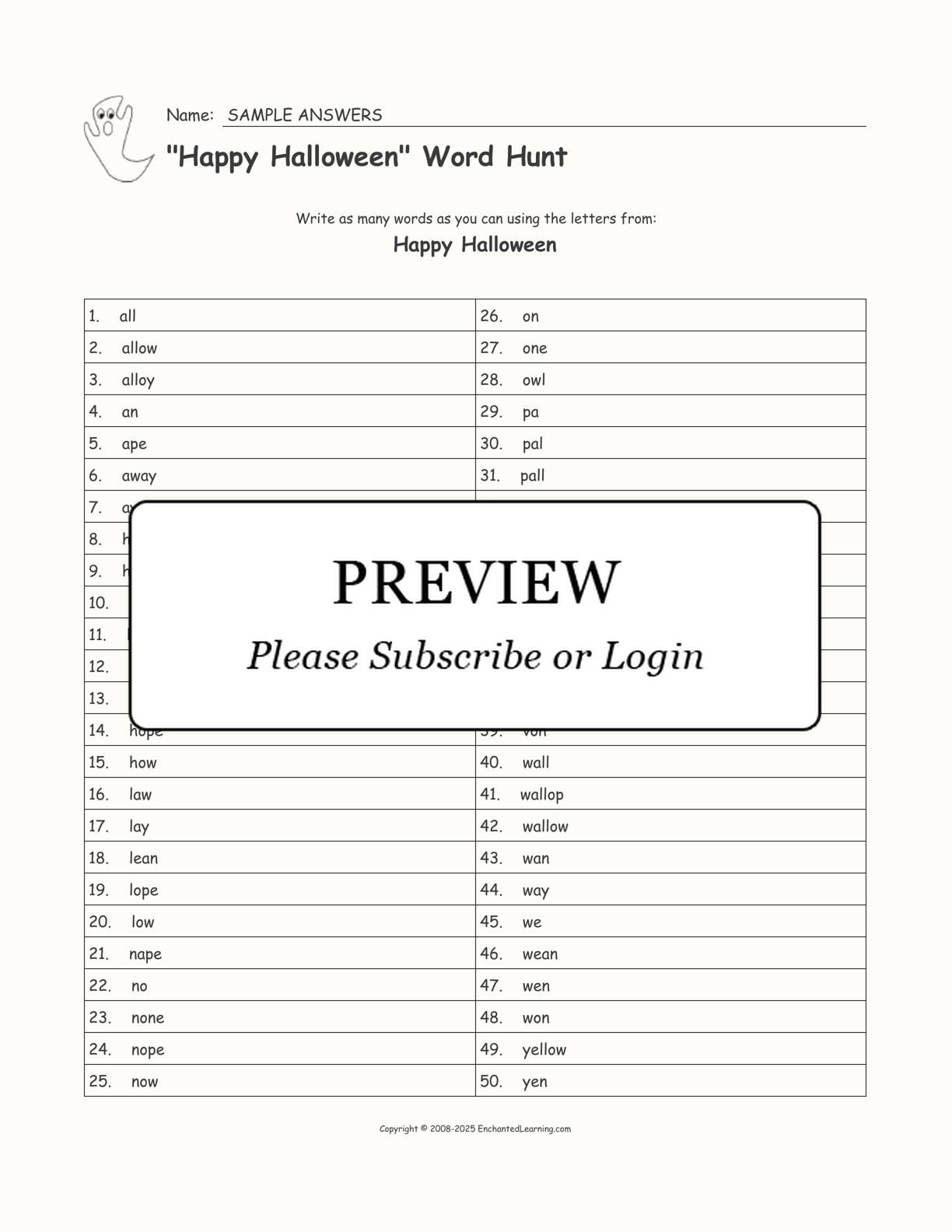 This is a 50-blank "Happy Halloween" Word Hunt. On this printable worksheet, make as many words from the phrase "Happy Halloween" as you can.