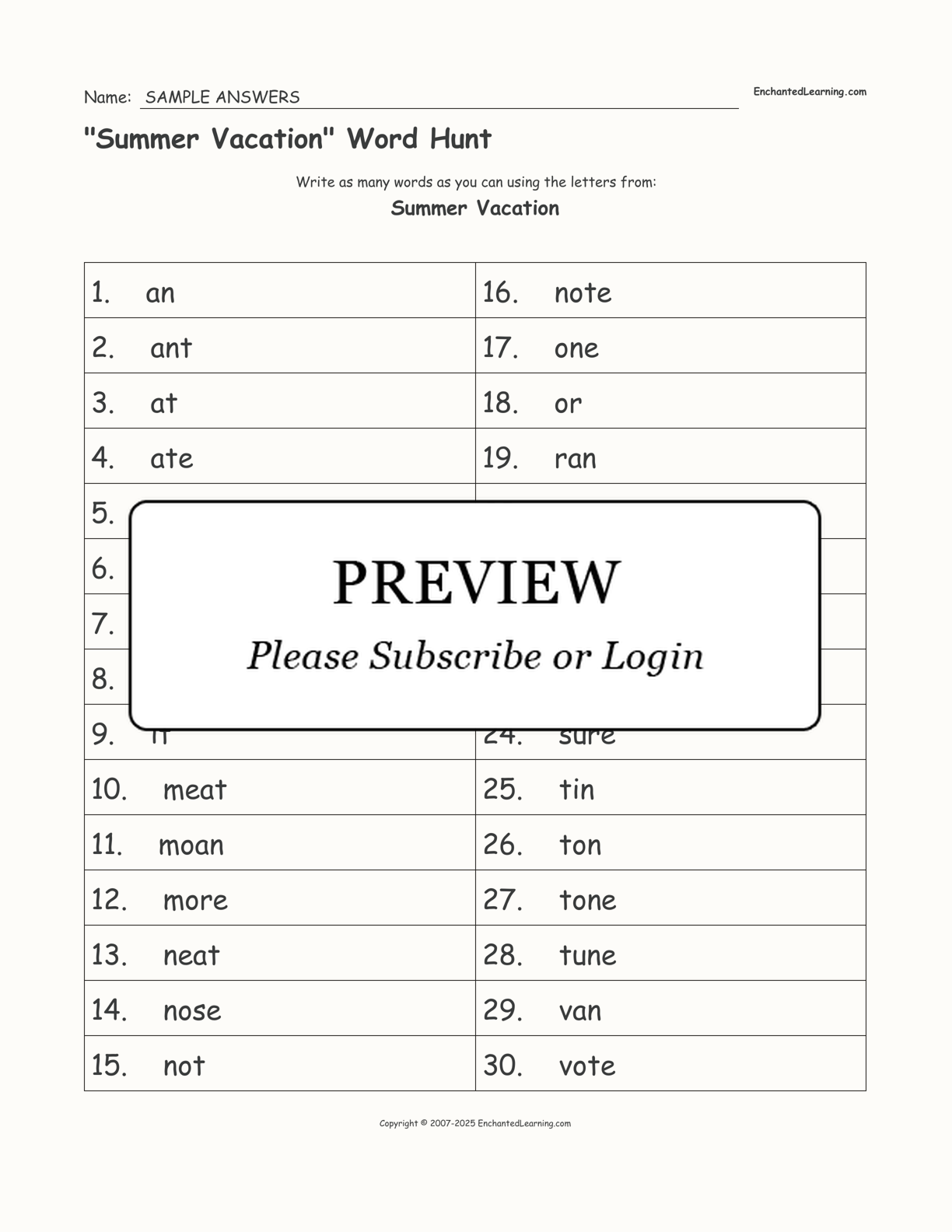 In this 30-blank word hunt worksheet, make as many words as you can from the phrase “Summer Vacation”.
