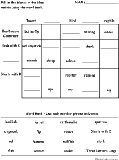 Idea Matrix Puzzle: Animal Words #1 In this sorting and classifying activity, the student fills in the blanks (and some categories) in an idea matrix using a word bank. Classify and sort the words by category and word structure. Word bank: basilisk, chipmunk, eel, fish, ferret, fly, mammal, rabbit, rattlesnake, roach, sailfish, snake, sparrow, Starts with S, stork, Three Letters Long. Or go to the answers. Or go to a pdf of the puzzle and the answers. |