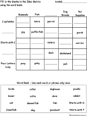 Idea Matrix Puzzle: Pets In this sorting and classifying activity, the student fills in the blanks (and some categories) in an idea matrix using a word bank. Classify and sort the words by category and word structure. Word bank: birds, boxer, cat, clownfish, collar, collie, damselfish, dog, doghouse, dove, fish, parakeet, poodle, rabbit, Starts with D, Starts with P. Or go to the answers. Or go to a pdf of the puzzle and the answers. |