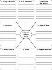 Write Music Words by Category Write music words by category. The categories include: String Instruments, Wind Instruments, Percussion Instruments, Styles of Music, Groups of Musicians, Singing, Musical Notation, and Composers. |