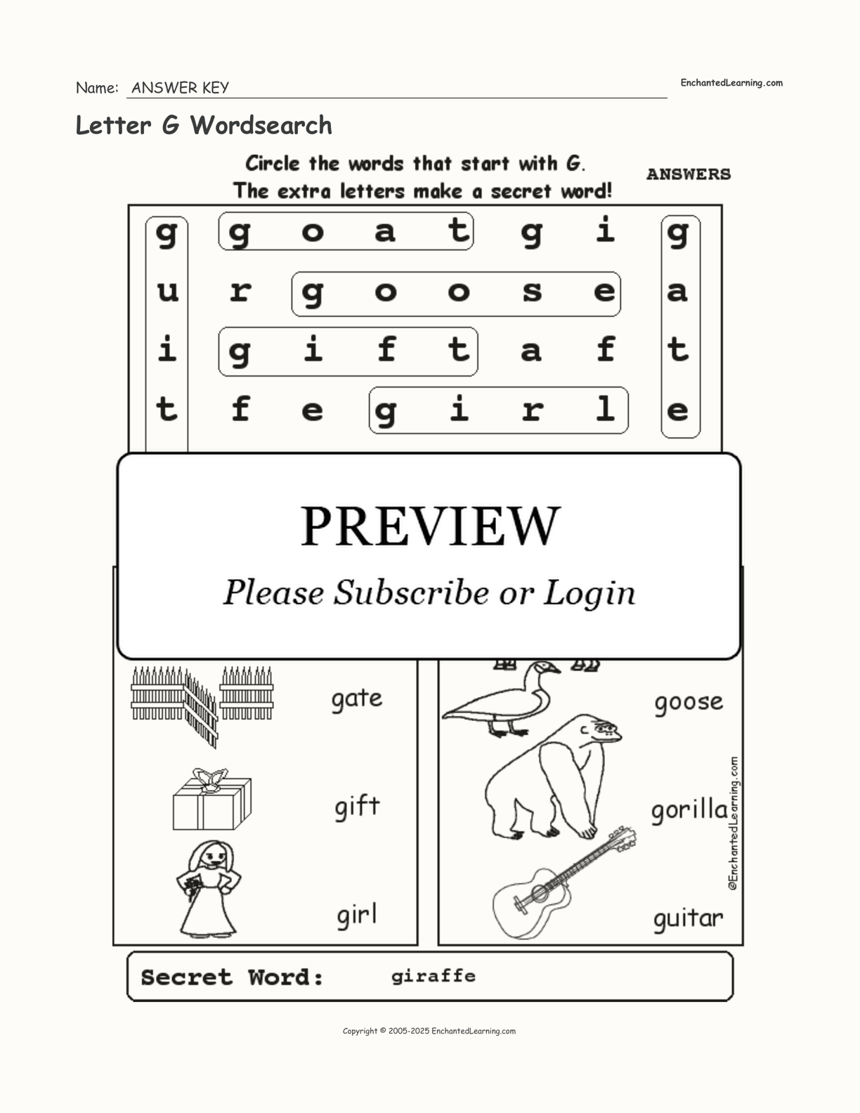 Letter G Wordsearch. Find all the words in the wordsearch puzzle, then use the extra letters to find the secret word: giraffe. This printout is for young students.