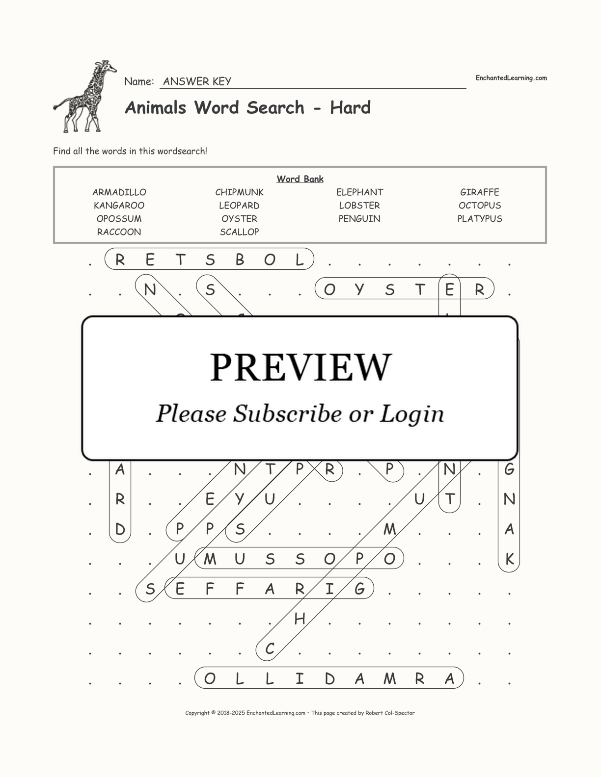 armadillo, chipmunk, elephant, giraffe, kangaroo, leopard, lobster, octopus, opossum, oyster, penguin, platypus, raccoon, scallop