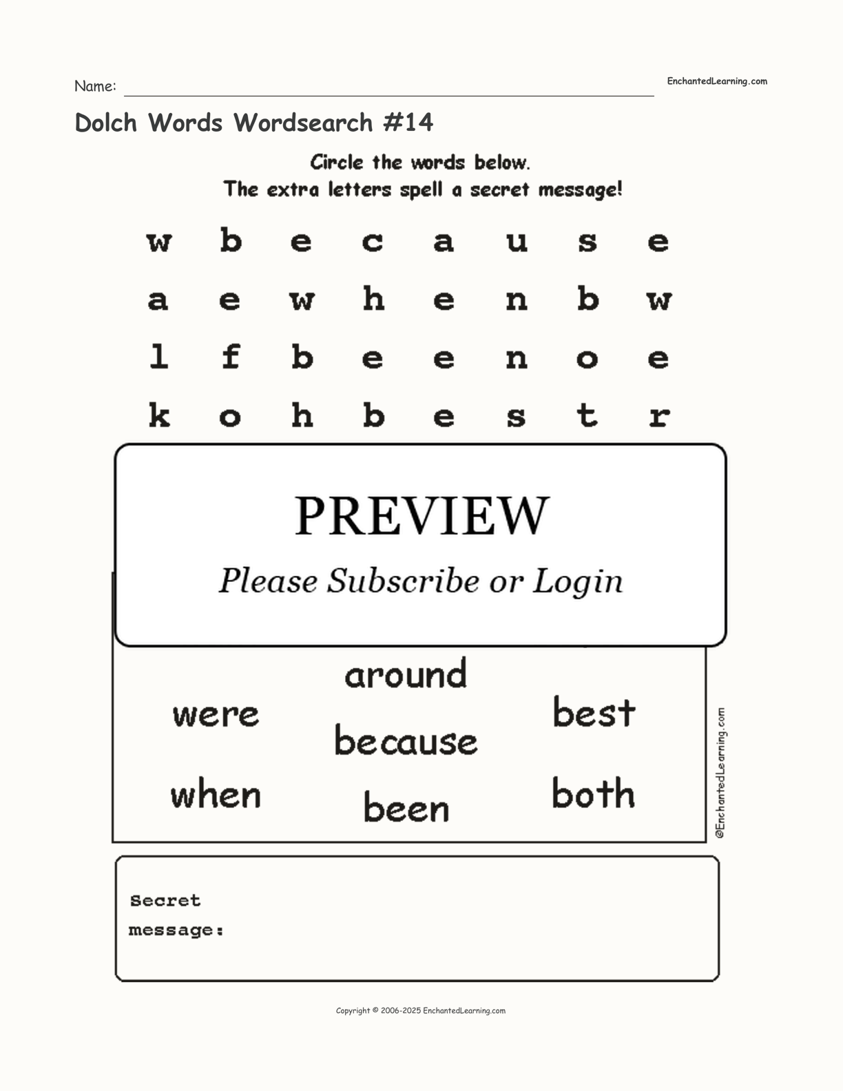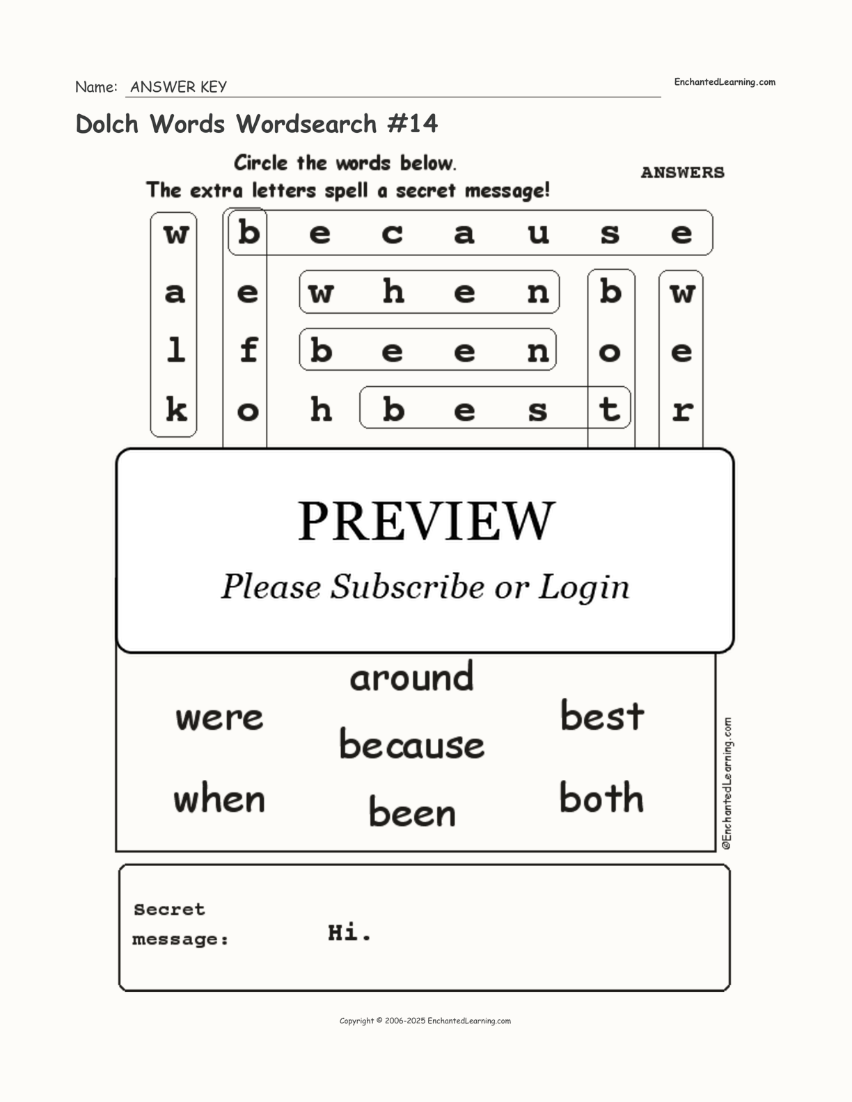 Dolch Words Wordsearch #14. Find all the words in this wordsearch puzzle, then use the extra letters to read a secret message: "Hi." This is a printout for young students.