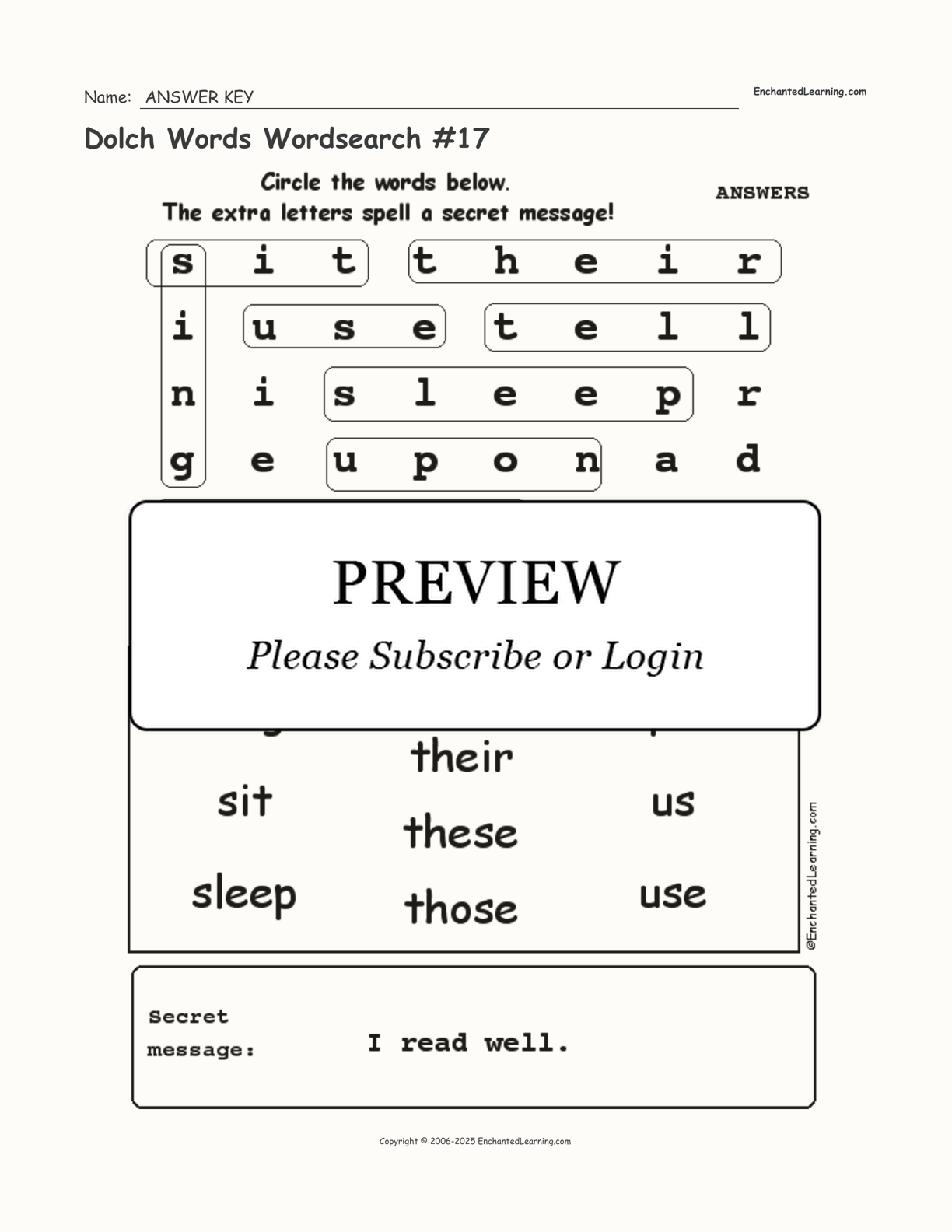 Dolch Words Wordsearch #17. Find all the words in this wordsearch puzzle, then use the extra letters to read a secret message: "I Read Well". This is a printout for young students.