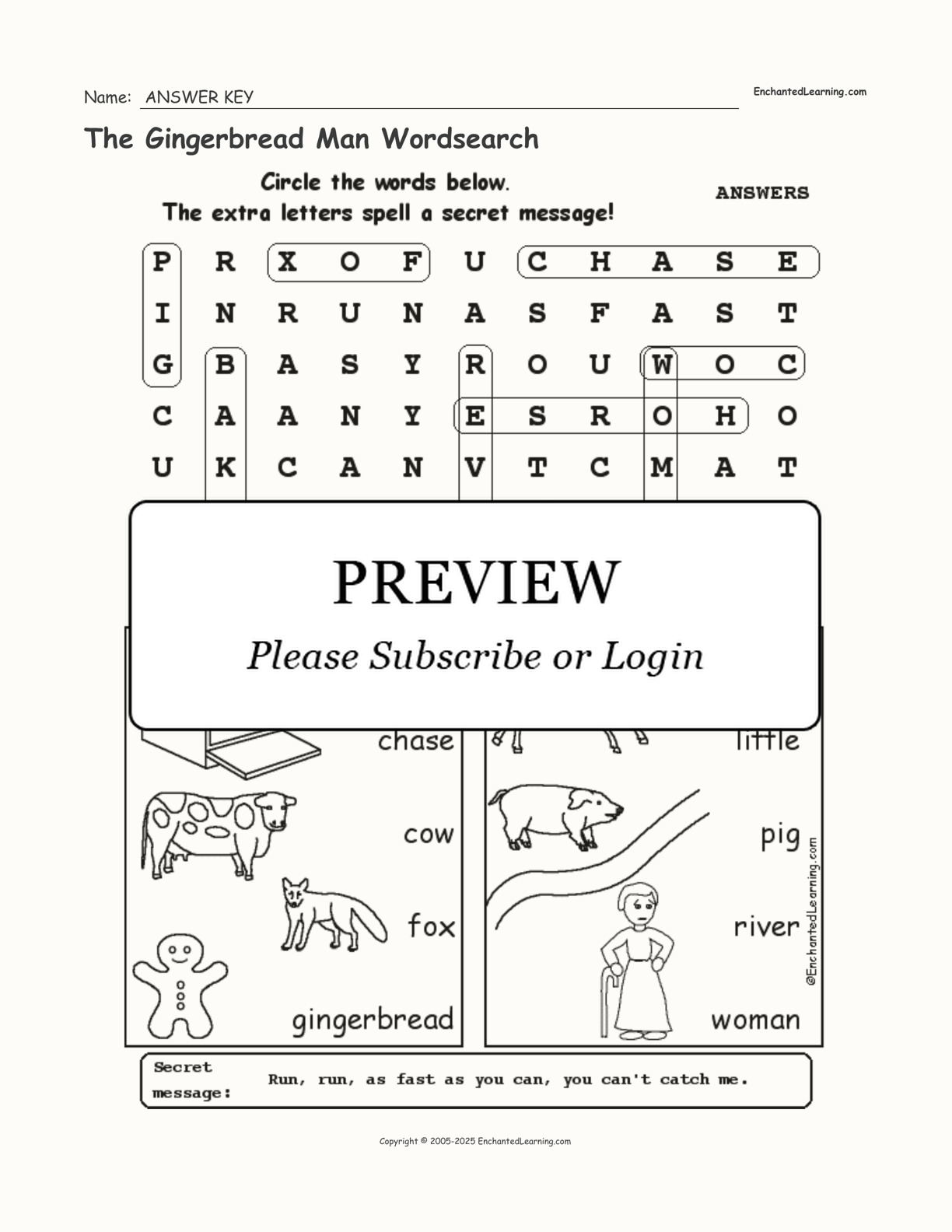 Find the words in ‘The Gingerbread Man’ wordsearch puzzle, then use the extra letters to find the secret message: “Run, run, as fast as you can, you can’t catch me”!
