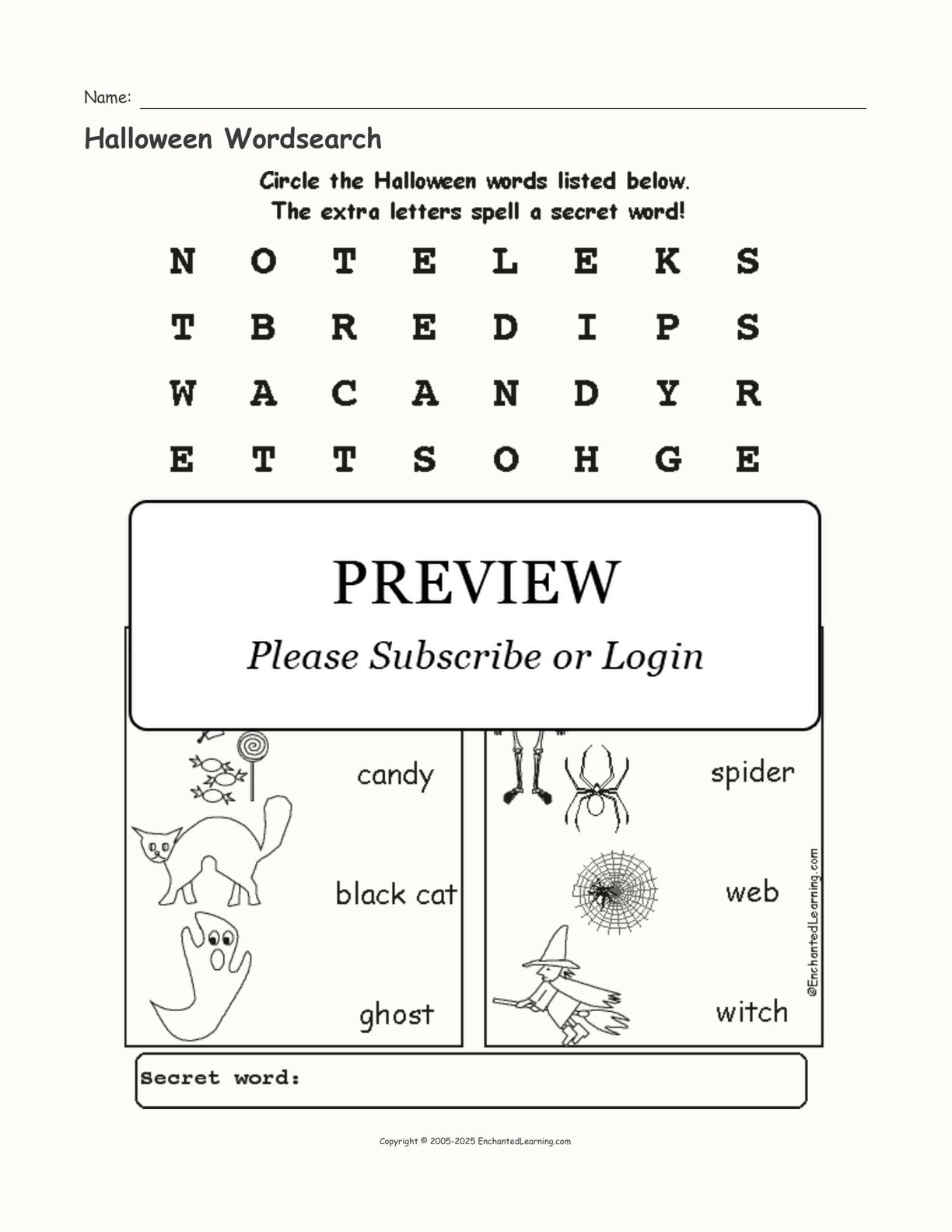 Find the words in this Halloween wordsearch puzzle, then use the extra letters to find the secret message: “Treat”.