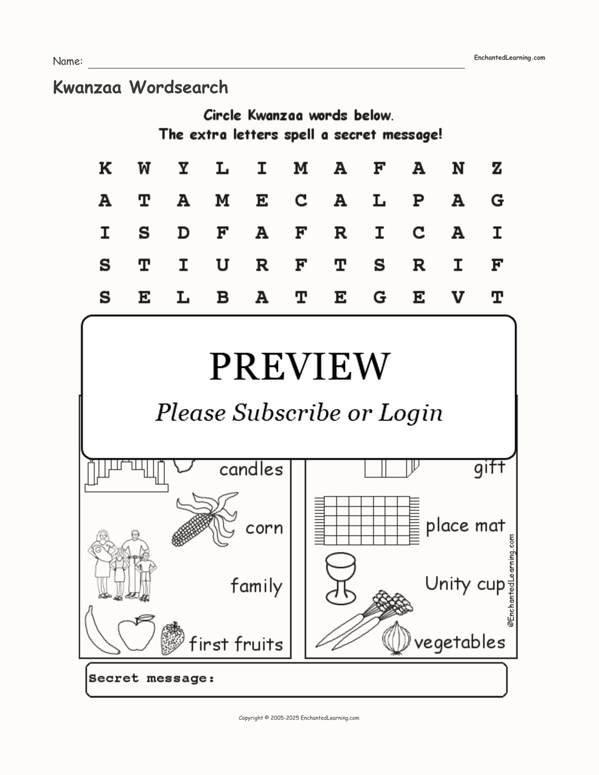 Kwanzaa Wordsearch. Find all the words in this wordsearch puzzle, then use the extra letters to read a secret message: 'Kwanzaa is fun'! This is a printout for young students.