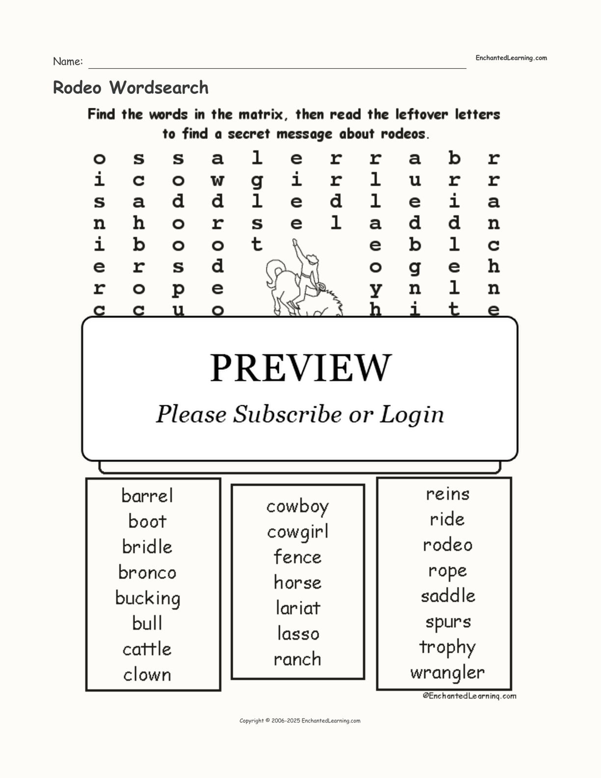 Rodeo Wordsearch. Find all the rodeo-related words in this wordsearch puzzle, then use the extra letters to read a secret message: 'Ride A Bronco'! This is a printout for young students.