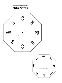 Make Words Wheel —o— This 2-page print-out makes a words wheel; it consists of a base page together with two wheels that spin around. The pages are attached using a brad. When you spin the wheel, words appear (not all are real words). Write as many words as you can that are made using the wheel. Answers: bob, bog, bot, bow, box, cob, cod, cog, con, cop, coy, cow, hod, hog, hop, hot, how, lob, log, lop, lot, low, lox, mob, mod, mop, mow, nod, not, now, sob, sod, son, sow, ton, top, tot, and tow. |