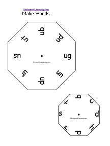 Make Words Wheel —u— This 2-page print-out makes a words wheel; it consists of a base page together with two wheels that spin around. The pages are attached using a brad. When you spin the wheel, words appear (not all are real words). Write as many words as you can that are made using the wheel. Answers: bud, bug, bun, bus, but, cub, cud, cup, cur, cut, dub, dud, dug, dun, hub, hug, hut, pub, pug, pun, pup, pus, put, rub, rug, run, rut, sub, sun, sup, tub, tug. |