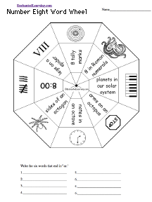 Number Eight Wheel This 2-page print-out makes an "Number Eight" wheel; it consists of a base page together with a wheel that spins around. The pages are attached using a metal brad. When cutting out the windows in the upper wheel, you can either cut out the answer window entirely or leave one side attached, creating a flap that can be opened and closed by the student. When you spin the wheel, things related to the number eight appear, including planets in our solar system, arms on an octopus, notes in an octave, sides of an octagon, 8:00, legs on a spider, 8 tally marks, and 8 in Roman numerals. The student then writes down the things related to the number eight. |