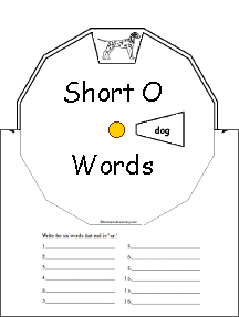 Short O Wheel This 2-page print-out makes a short o wheel; it consists of a base page together with a wheel that spins around. The pages are attached using a brad. Note: the back wheel is slightly larger than the front wheel; this makes it easier to turn the wheel. When you spin the wheel, short o words appear, including the words: dog, mop, dot, doll, moth, robin, mom, frog, box, sock, log, and pot. Write the 12 short "o" words that are on the wheel. |