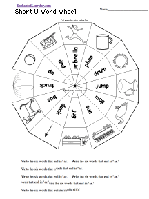 Short U Wheel This 2-page print-out makes a short u wheel; it consists of a base page together with a wheel that spins around. The pages are attached using a brad. Note: the back wheel is slightly larger than the front wheel; this makes it easier to turn the wheel. When you spin the wheel, short u words appear, including the words: jump, mug, sun, jug, duck, bus, truck, up, pup, umbrella, plum, and drum. Write the 12 short "u" words that are on the wheel. |