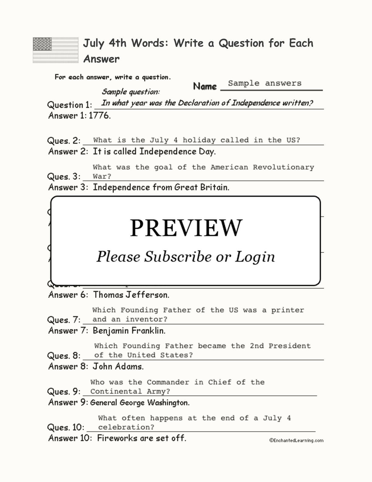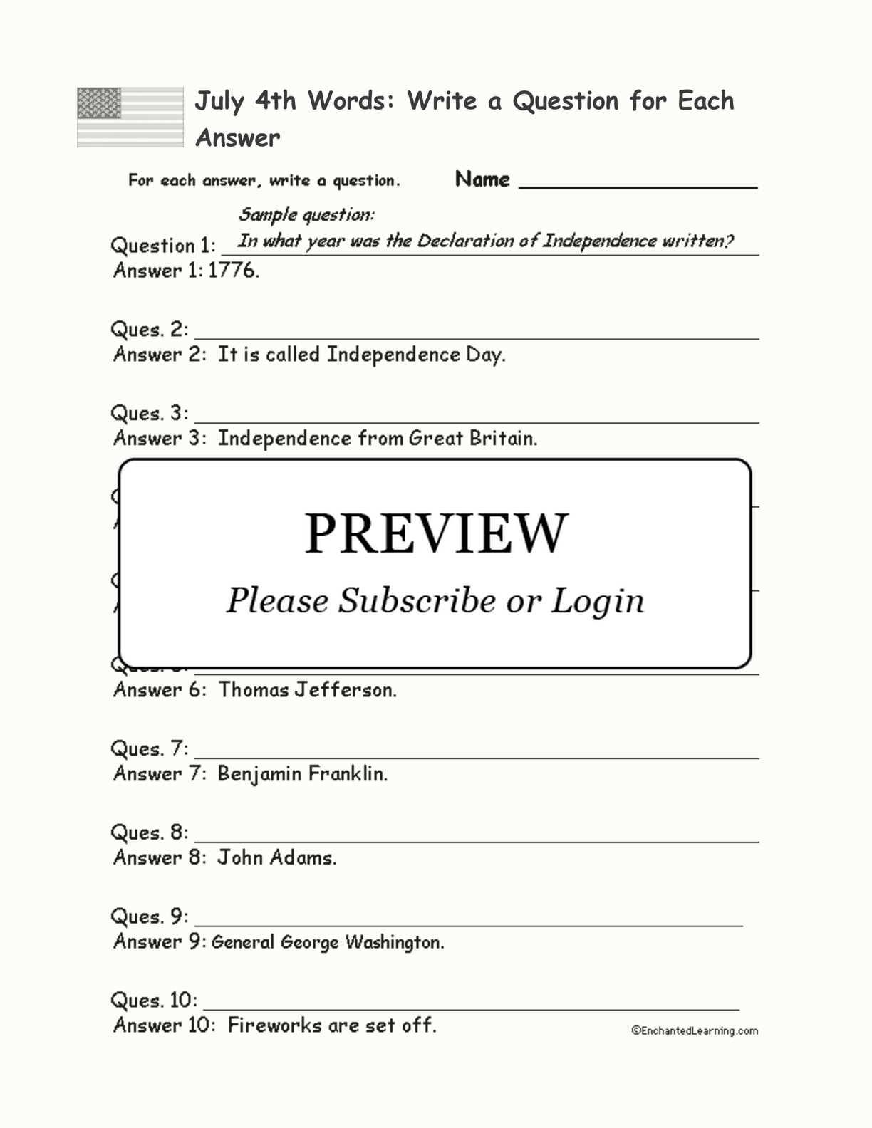 This is a printable worksheet for US Independence Day. Students should write a question for each answer, giving practice in writing sentences.