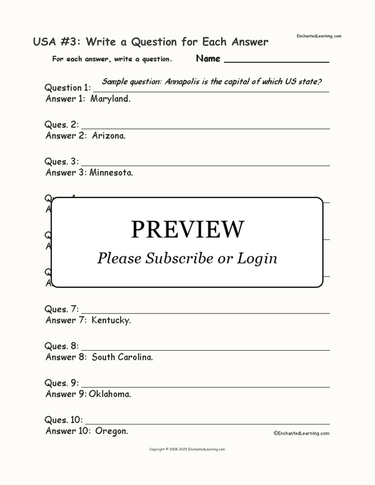 In this worksheet, the student is given a series of short answers using US states. For each answer, the student writes a short question.