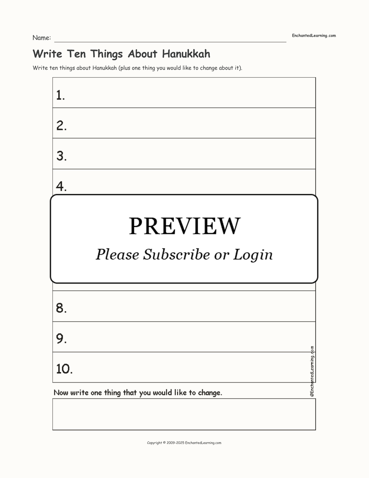 Write ten things about Hanukkah (plus one thing you'd like to change about it). This is a short-answer printable worksheet.