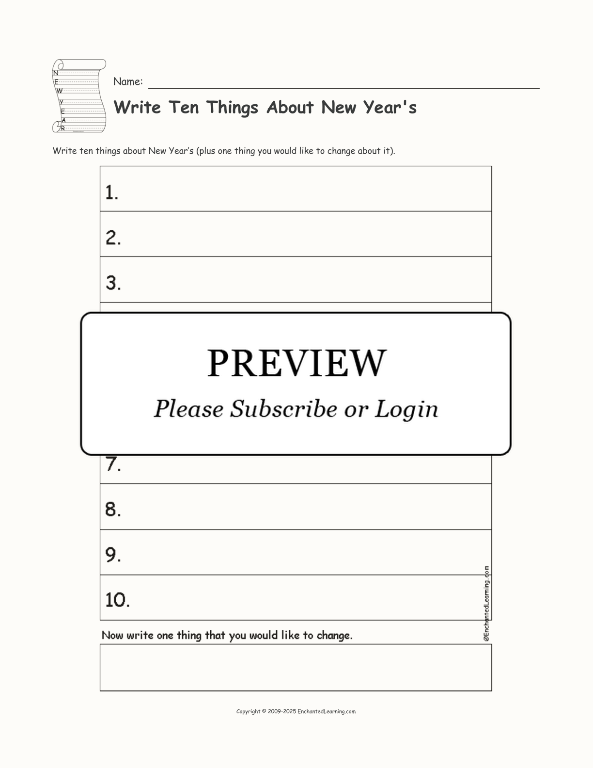 Write ten things about New Year's (plus one thing you would like to change about it). This is a short answer printable worksheet.