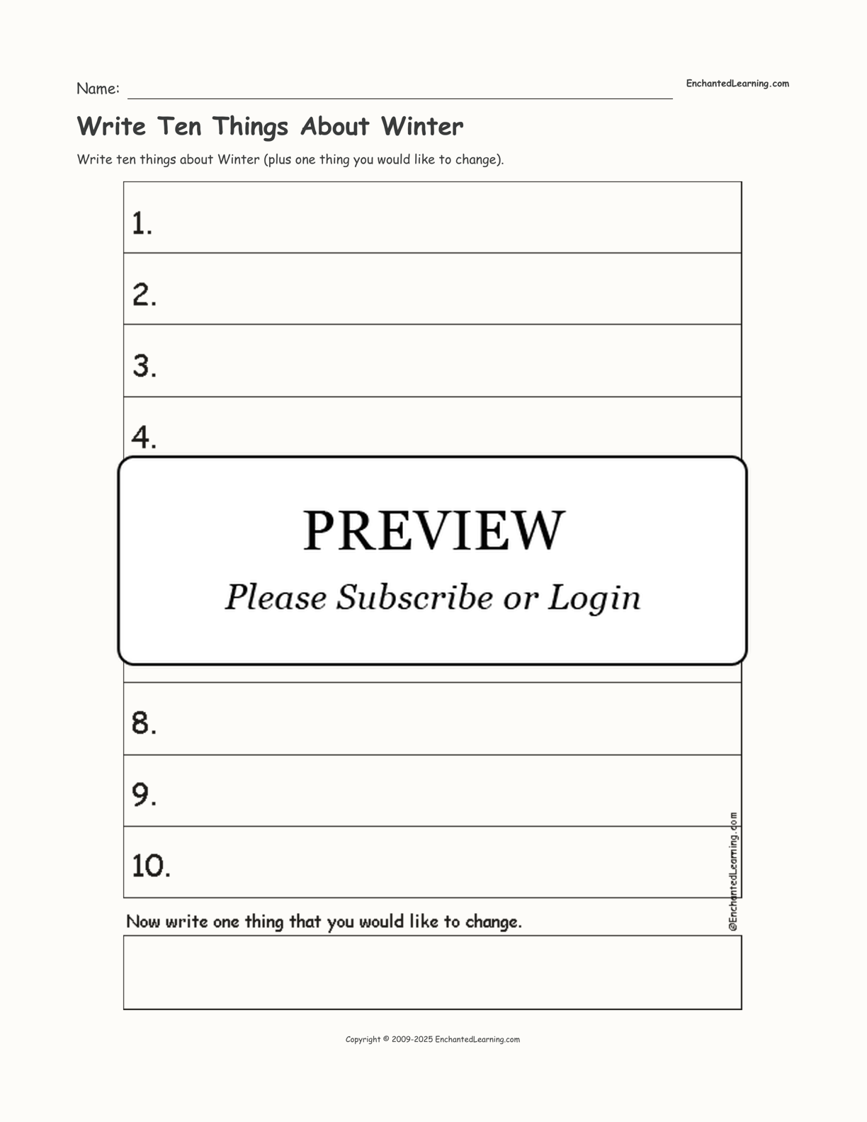Write ten things about Winter (plus one thing you would like to change) in this printable worksheet.